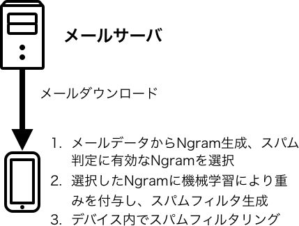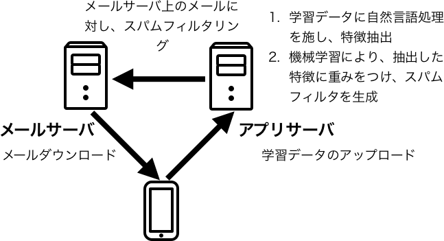 本アプリのスパムフィルタリングは、一般的なスパムフィルタリングとは異なる実装をしている。一般的なスパムフィルタリングでは、指定された学習データをアプリサーバにアップロードし、アプリサーバで機械学習を行い、アプリサーバがスパムフィルタリングを行う。このことは、学習データであるユーザのメールが第三者のサーバで解析、管理されることを意味する。さらに、アプリサーバがメールサーバに対してスパムフィルタリングを行うことは、データ・プライバシー上、大きな問題になる。